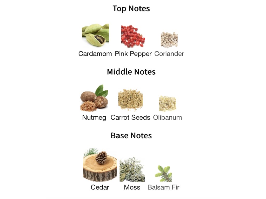Hlavné tóny: kardamóm, ružové korenie, koriander, muškátový oriešok, kadidlo, céder, mach