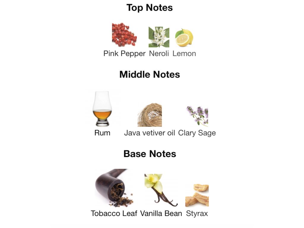 Základ je hlboký, tichý a veľmi zmyselný. Tabakové listy sa spájajú s jemnou sladkosťou vanilky, zatiaľ čo styrax dodáva balzamickú hrejivosť. Na pokožke zanechá stopu, ktorá pripomína kožené kreslá, lampové svetlo a tón saxofónu v pozadí.