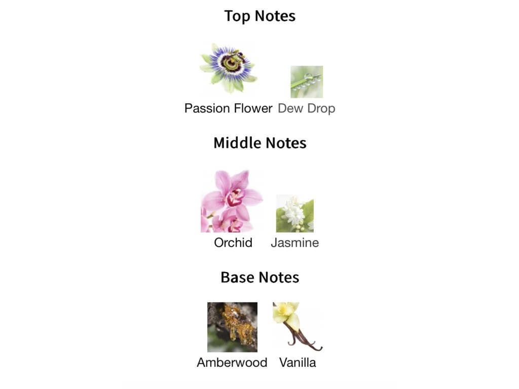 Hlavné tóny: passionflower, rosa, orchidea, jazmín, ambra, vanilka