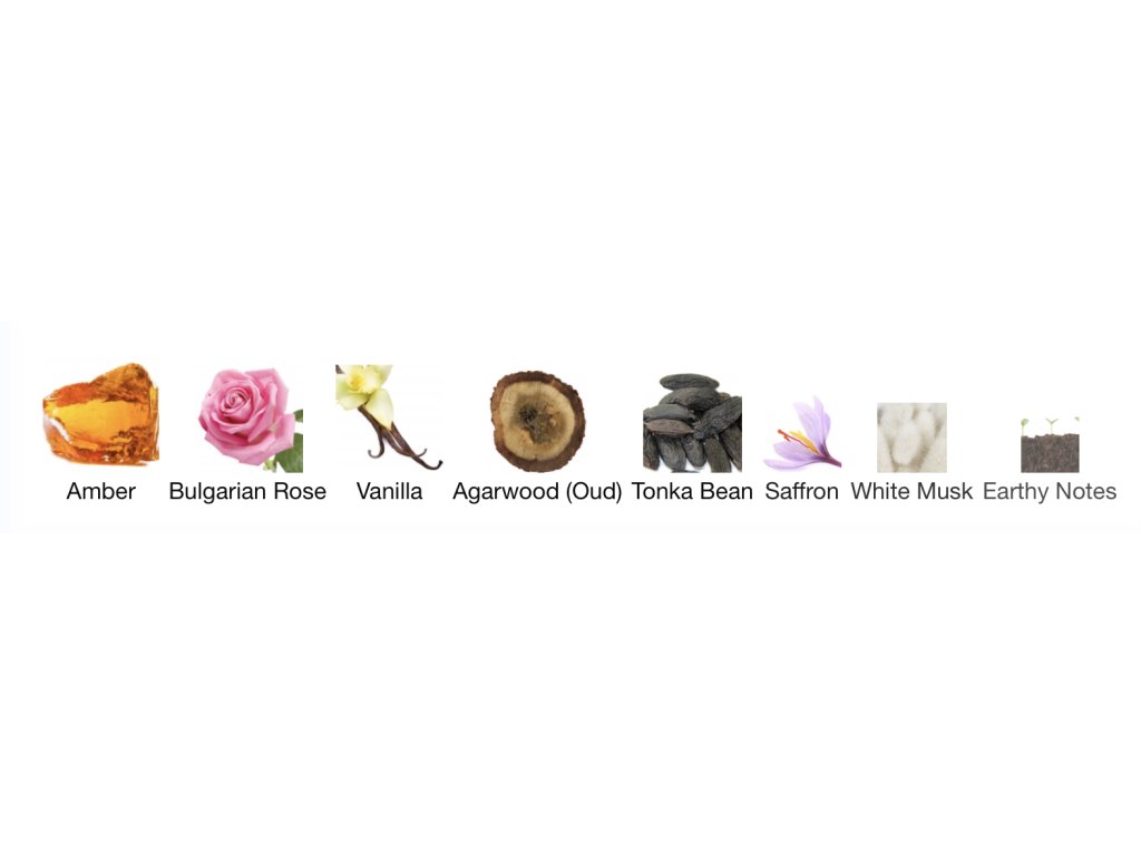Kompozíciu otvára majestátna bulharská ruža a korenistý šafran, ktoré okamžite navodia orientálnu atmosféru. V srdci sa mieša vzácny oud (agarwood) s jemnou sladkosťou vanilky a tonkových bôbov, čím vzniká hlboká a zmyselná harmónia. Základ uzatvára hrejivá ambra, čisté biele pižmo a zemité tóny, ktoré dodávajú parfému dlhú výdrž a noblesný podpis.