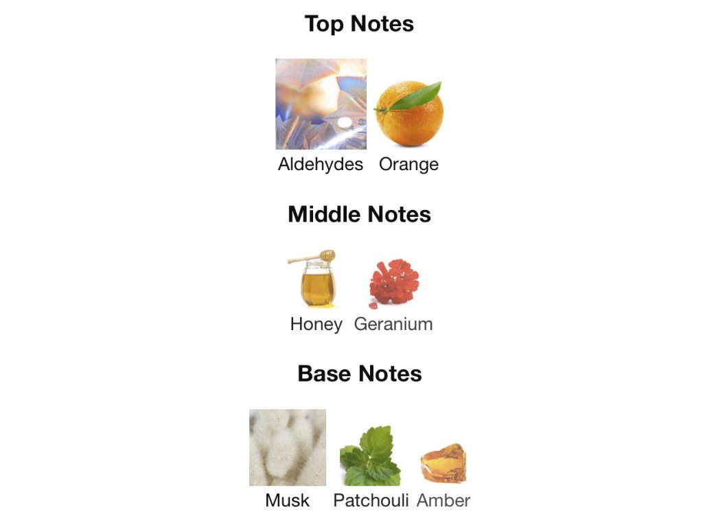 Úvod otvára iskrivý tón aldehydov a sladkastá šťava zo zrelého pomaranča. V srdci sa rozvíja zamatová medová sladkosť prepojená s jemne korenistým gerániom. Základ uzatvára čisté pižmo, zemitá pačuli a hrejivá ambra, ktoré dodávajú vôni sofistikovanú hĺbku a dlhú výdrž.